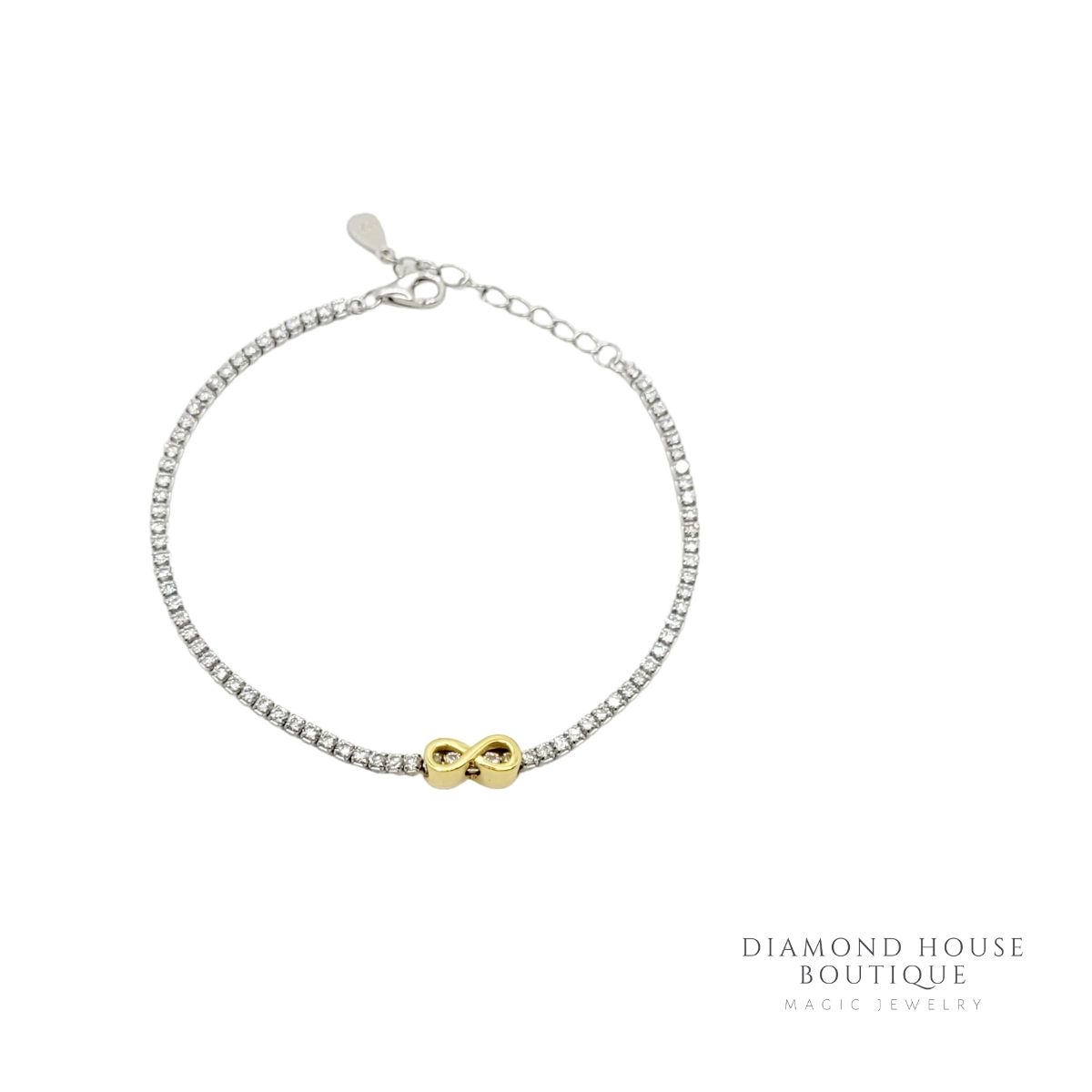 Bratara argint 925.rodiata ,model tennis cu pietricele albe de zirconiu si semnul infinitului,placat cu aur galben 14k.Charmul de pe bratara nu este fix,este mobil.
