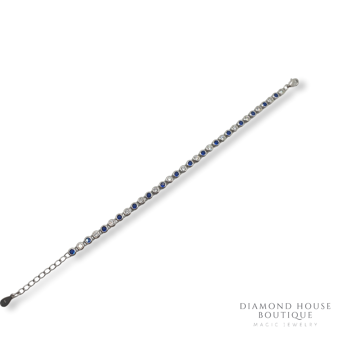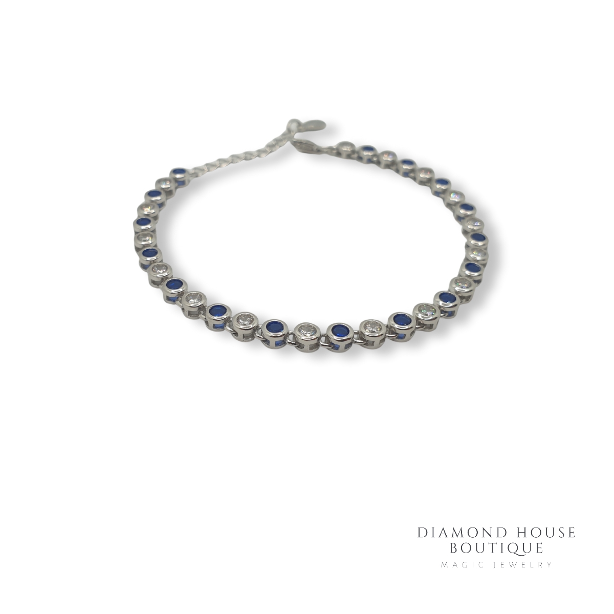 Bratara argint 925,rodiata cu aspect de aur alb.Modelul bratarii este tennis cu pietricele albe de zirconiu  si albastre.Pietrele sunt incastrate perfect.Modelul este fin si super trendy.