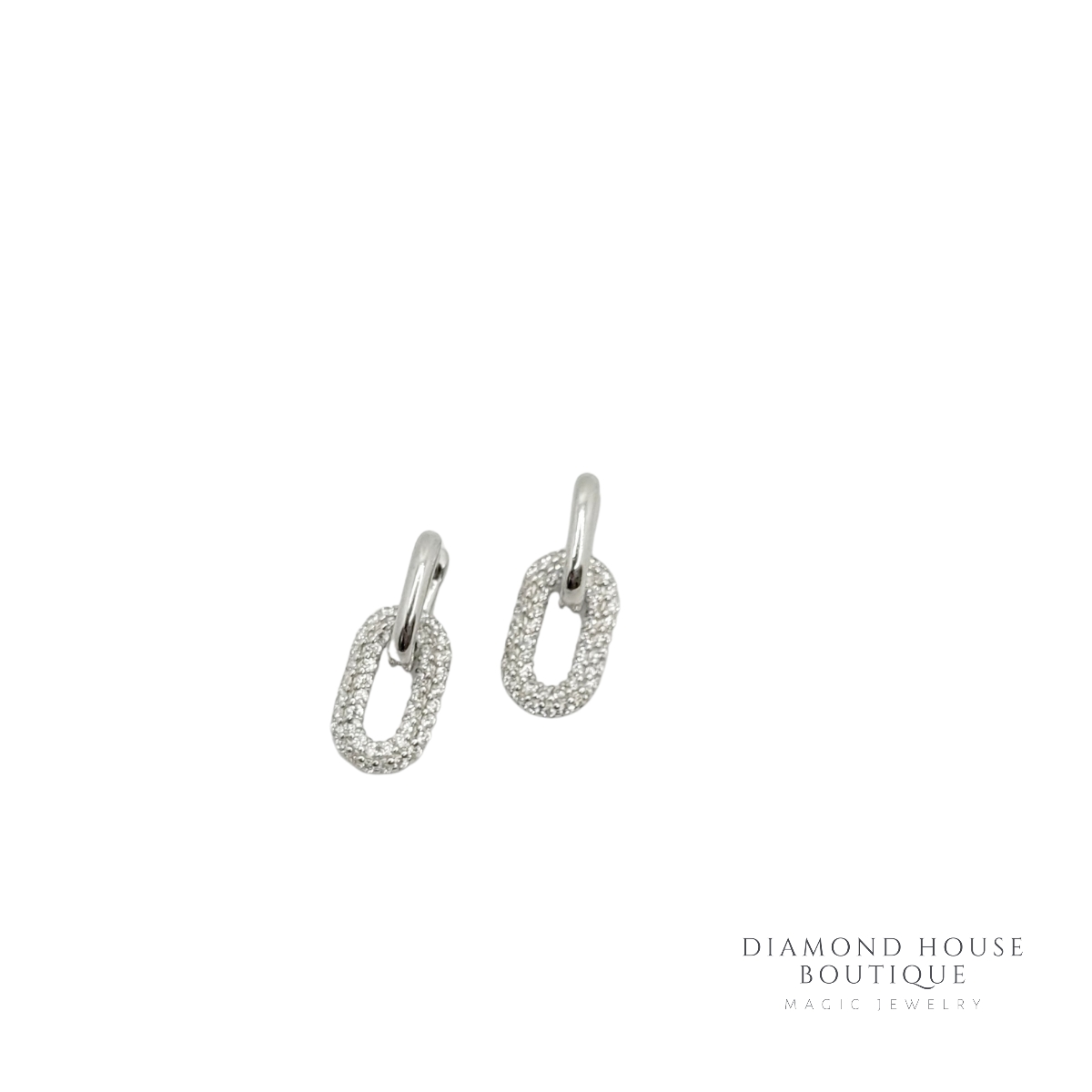 Cercei argint 925,rodiati,cu aspect de aur alb.Acestia au o inchidere sigura.Atasati au un oval plin cu pietricele albe de zirconiu.Se pot purta simpli sau detasat.