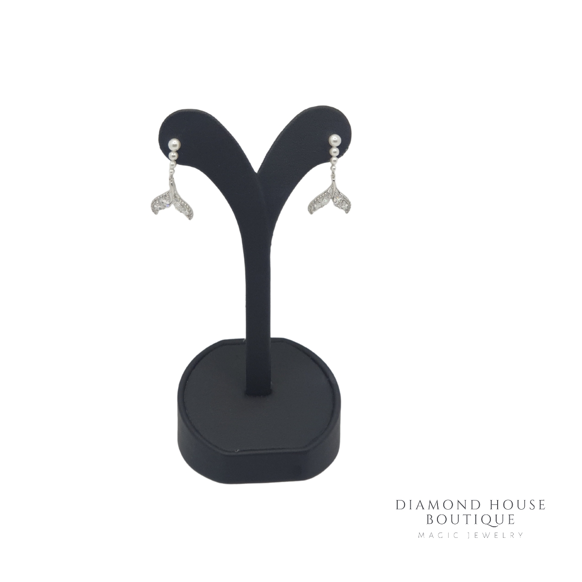 Cercei argint 925,rodiati cu aspect de aur alb.Acestia arata ca si o codita de sirena,sunt formati din patru  perle albe  si pietre de zirconiu,atent montate,pentru ai da o nota de stralucire.Inchiderea este surub.