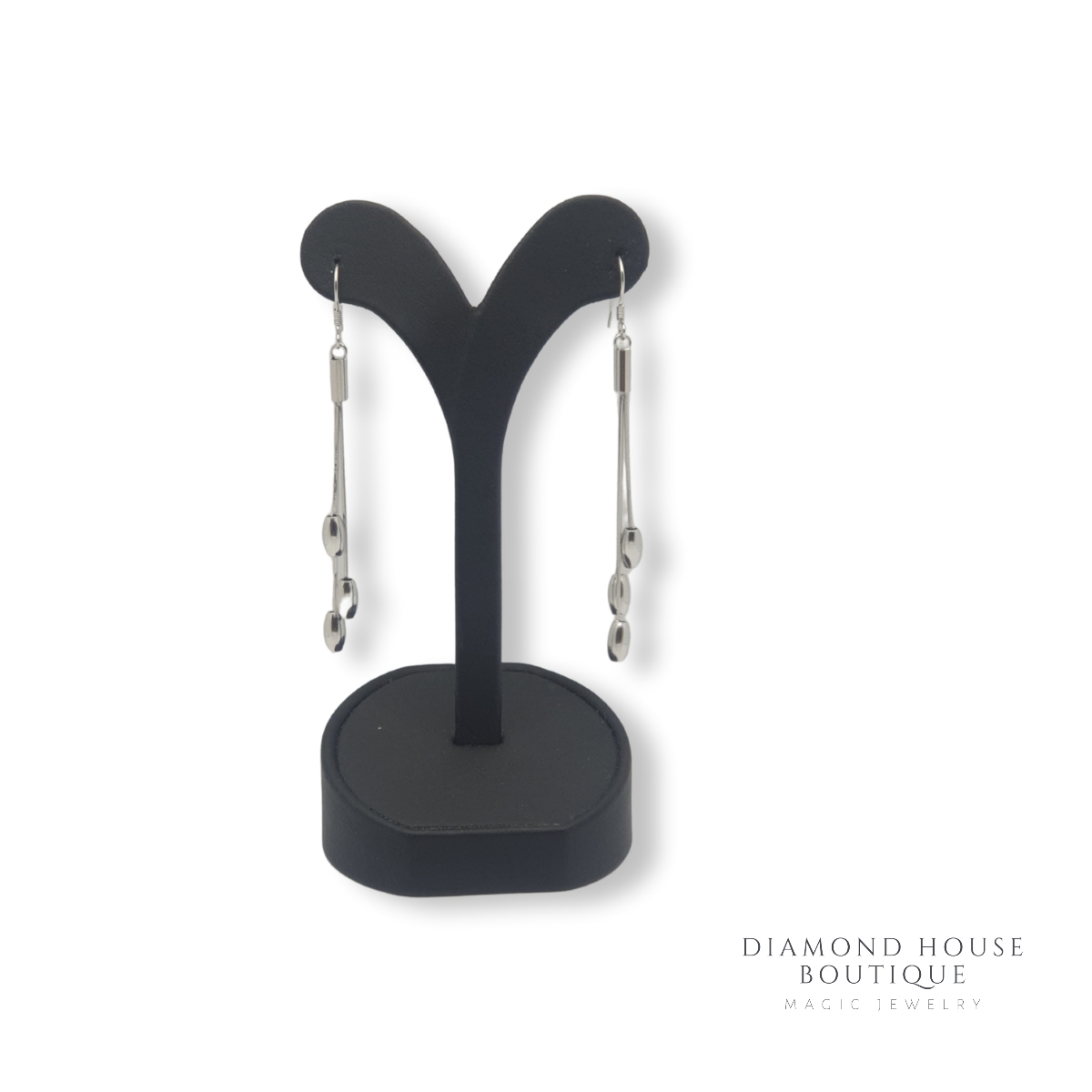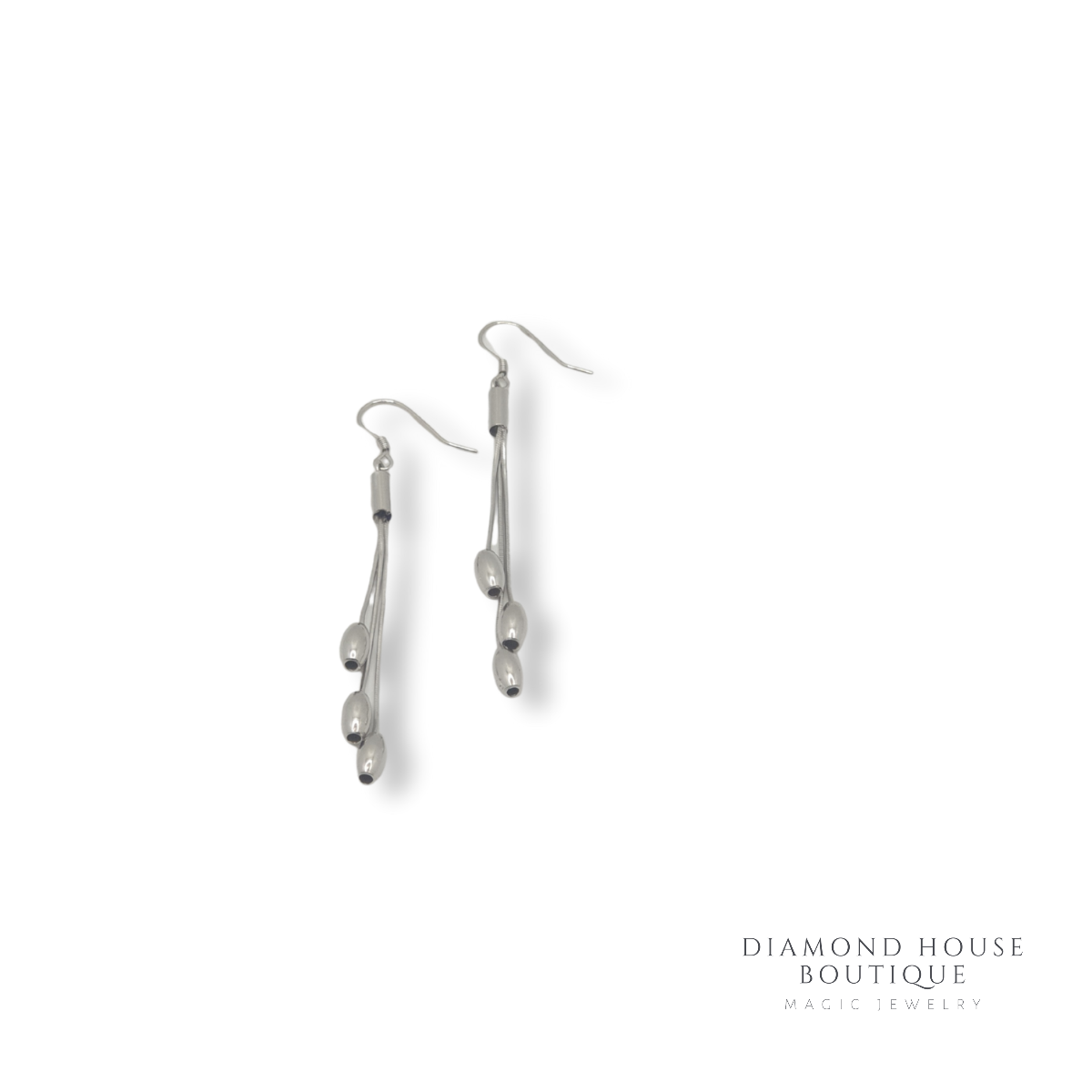 Cercei argint 925,rodiati ce se agata in ureche.Acestia au in jos 3 lanturi ce au prinse la capete trei elemente lucioase.Acestia pot fi purtati in orice moment al zilei.
