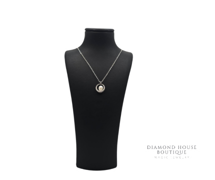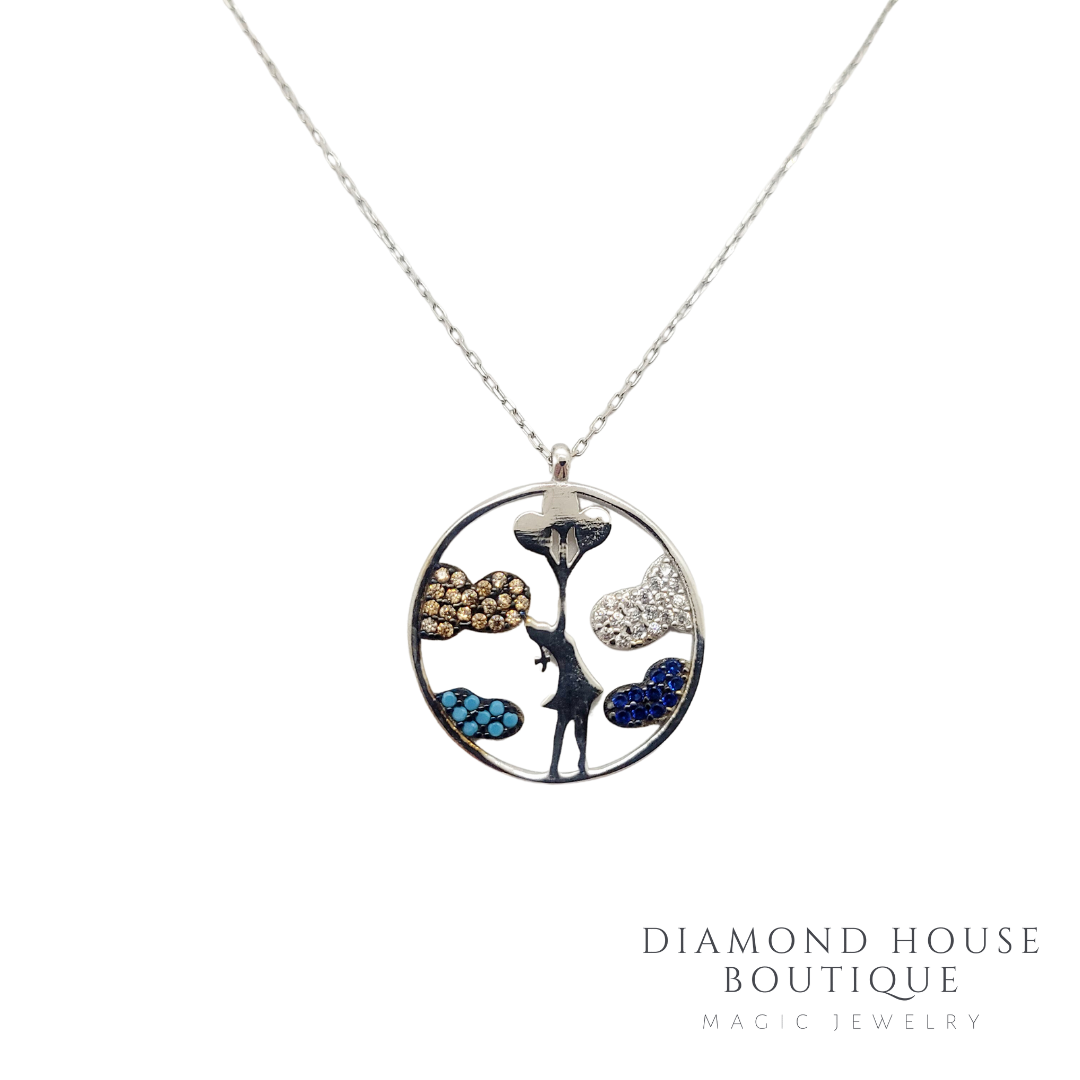 Colier argint 925 cu pandantiv rotund cu pietricele colorate de zirconiu.In interioru cercului se afla imaginea unei fetite cu baloane si nori colorati.