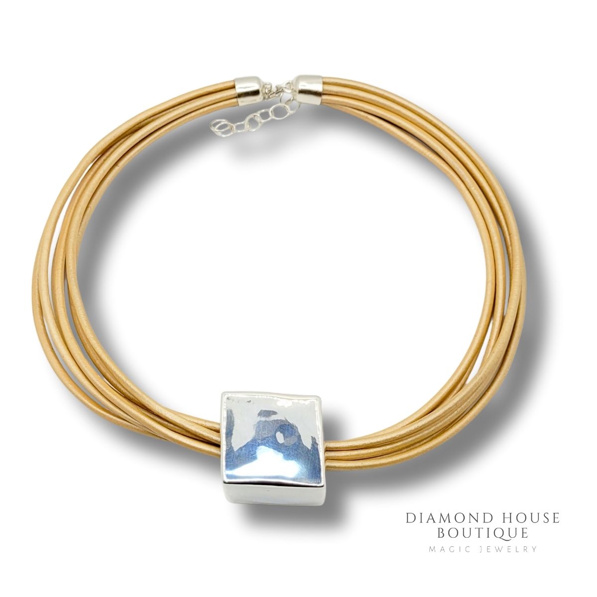 Colier argint 925 din piele de culoare bej deschis.Pe colier este un cub care nu este fix.Tehnica prin care a fost realizat este electroforming.Designul este unic in Romania.
