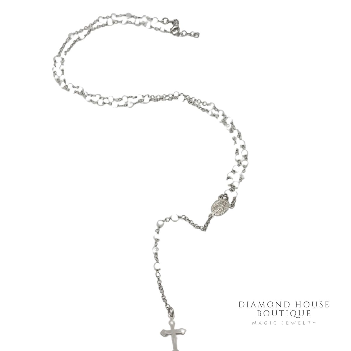 Colier argint 925,rodiat cu pietricele albe,model rosariu.Acesta are si cruciulita si o iconita mica cu Maica Domnului.