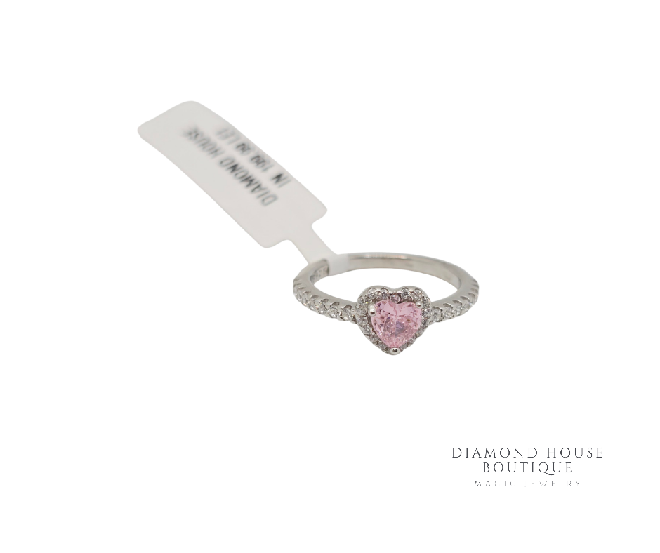 Inel din argint 925 cu piatră roz în formă de inimă, delicat înconjurată de cristale fine ce îi accentuează strălucirea.