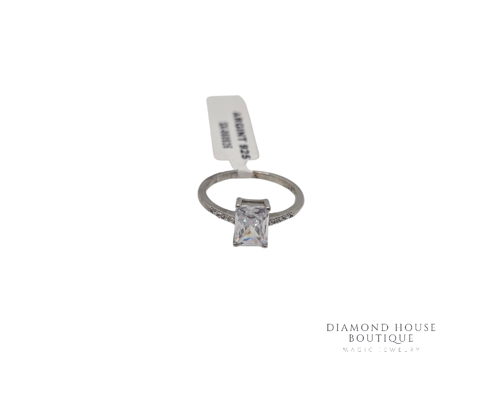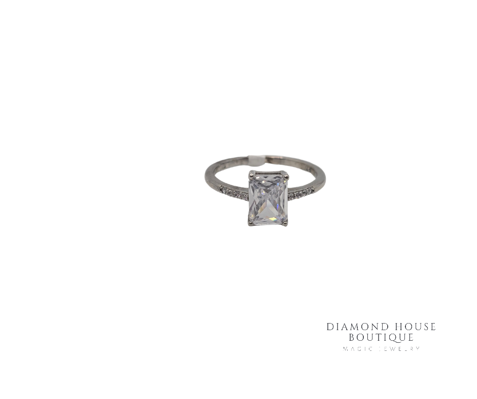Inel din argint rodiat, cu piatră centrală dreptunghiulară din zirconiu alb, ce captează elegant lumina la fiecare mișcare.