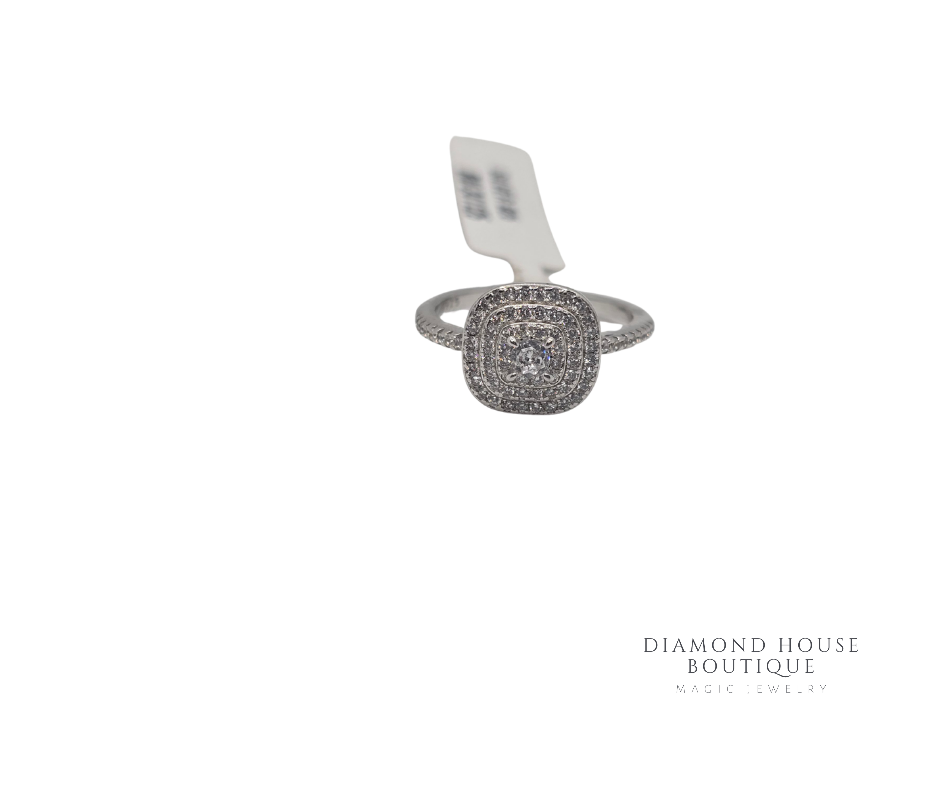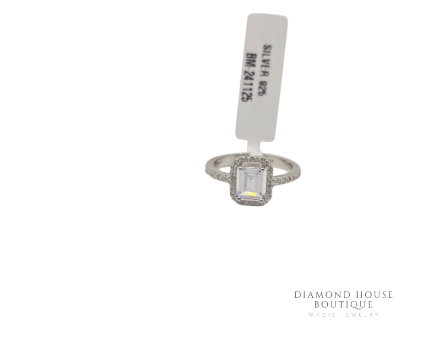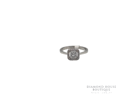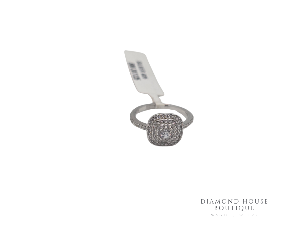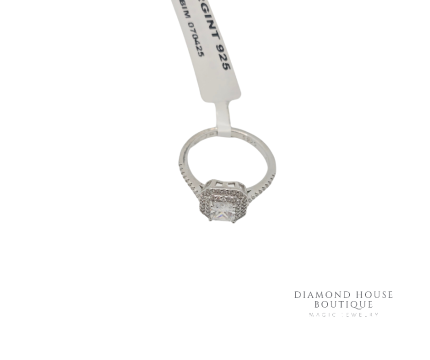 Inel din argint rodiat, cu design sofisticat și piatră centrală din zirconiu alb, înconjurată de mai multe rânduri de pietre strălucitoare.