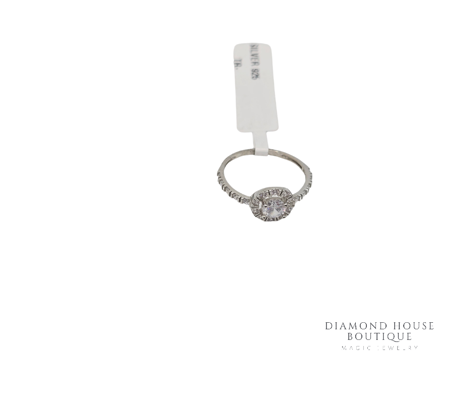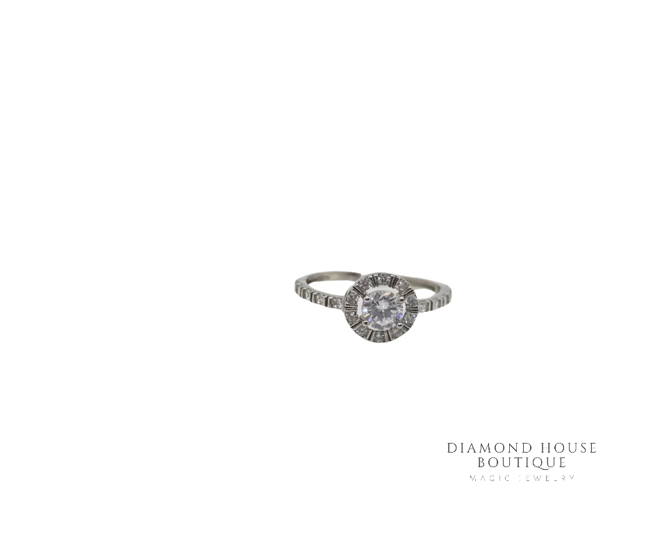 Inel din argint rodiat, cu piatră centrală rotundă din zirconiu alb, înconjurată de un halo strălucitor pentru un efect spectaculos.