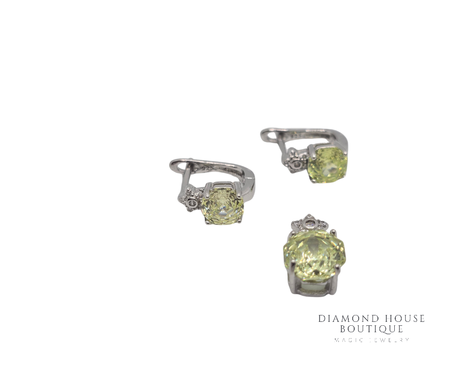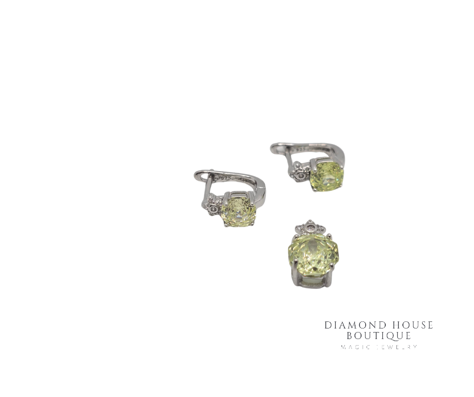 Set din argint rodiat, format din cercei și pandantiv, decorat cu pietre CZ în nuanțe delicate de galben-lamai, ce oferă o strălucire elegantă.