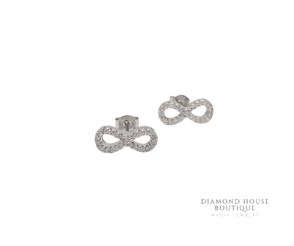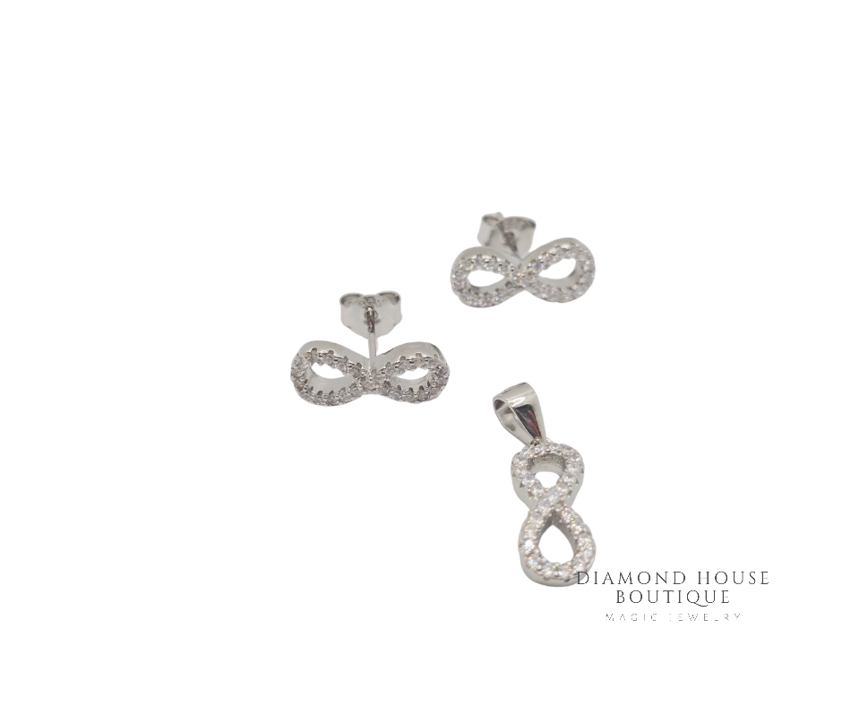 Set din argint 925 rodiat, format din cercei și pandantiv, decorat cu pietre CZ strălucitoare în formă de infinit.