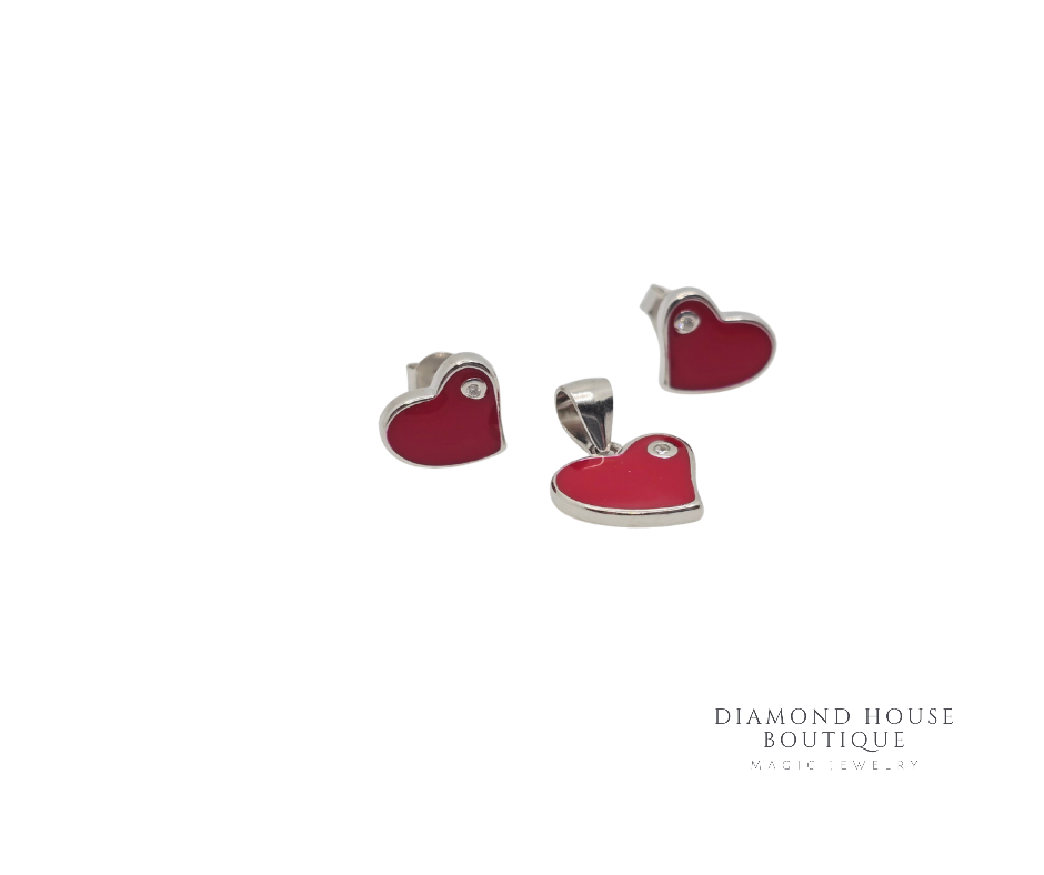 Set din argint 925 rodiat, format din cercei și pandantiv în formă de inimă, evidențiat de nuanța intensă de roșu și accente fine de CZ si rosu email.